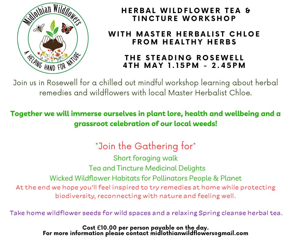 Our wonderful, wild partners Midlothian Wildflowers are hosting a ‘Herbal Wildflower Tea And Tincture Workshop’ at The Steading, Rosewell on 4th May. Join the gathering! See attached poster for details.